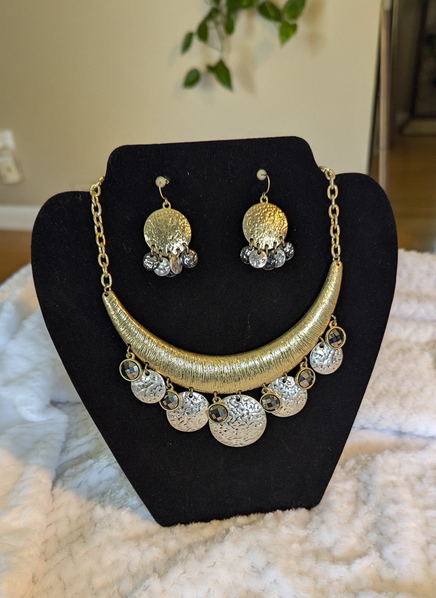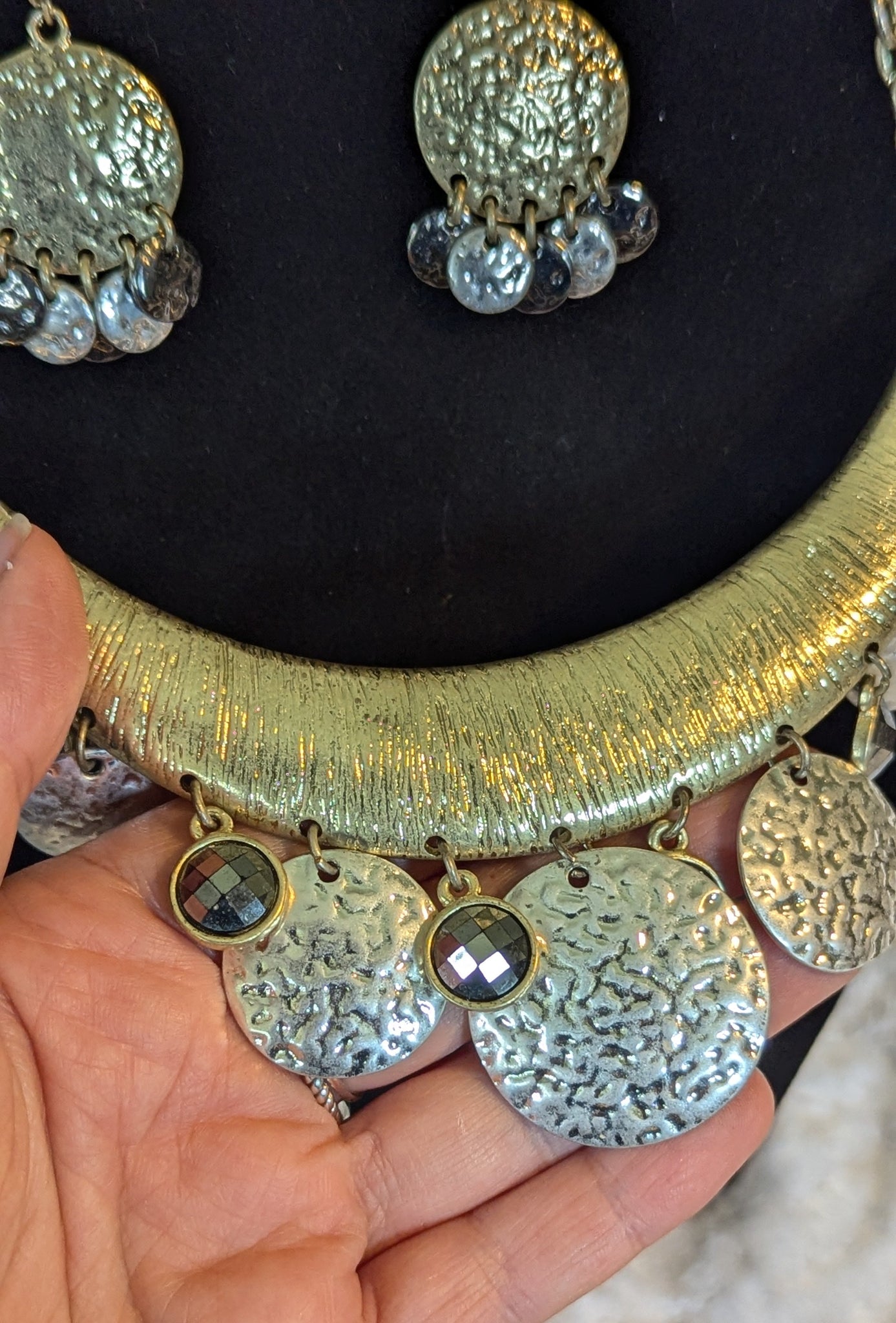 Striking boho-glam statement set featuring a bold crescent-collar necklace and matching earrings. Each piece combines gold- and silver-tone hammered metal discs with faceted hematite-style accents for a look that’s both elegant and edgy.
