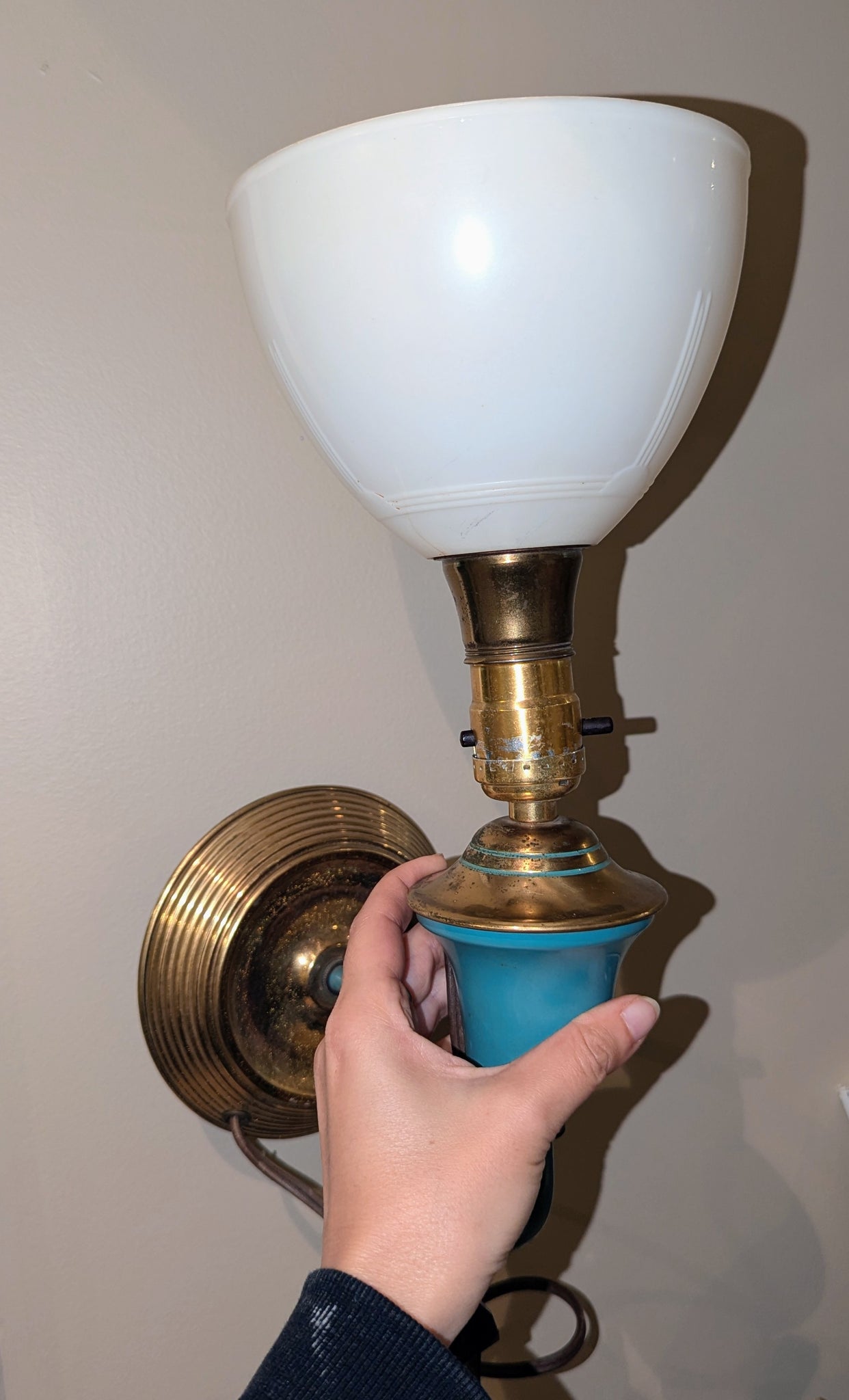Genuine MCM wall sconce by Elite Electric Co. (Hydro-Electric Power Commission approved, Canada). Features a beautiful turquoise enamel arm and base, polished brass socket and wall plate, and an original white plastic lampshade with deco ridge detail. Classic 1950s color palette and elegant MCM curves.