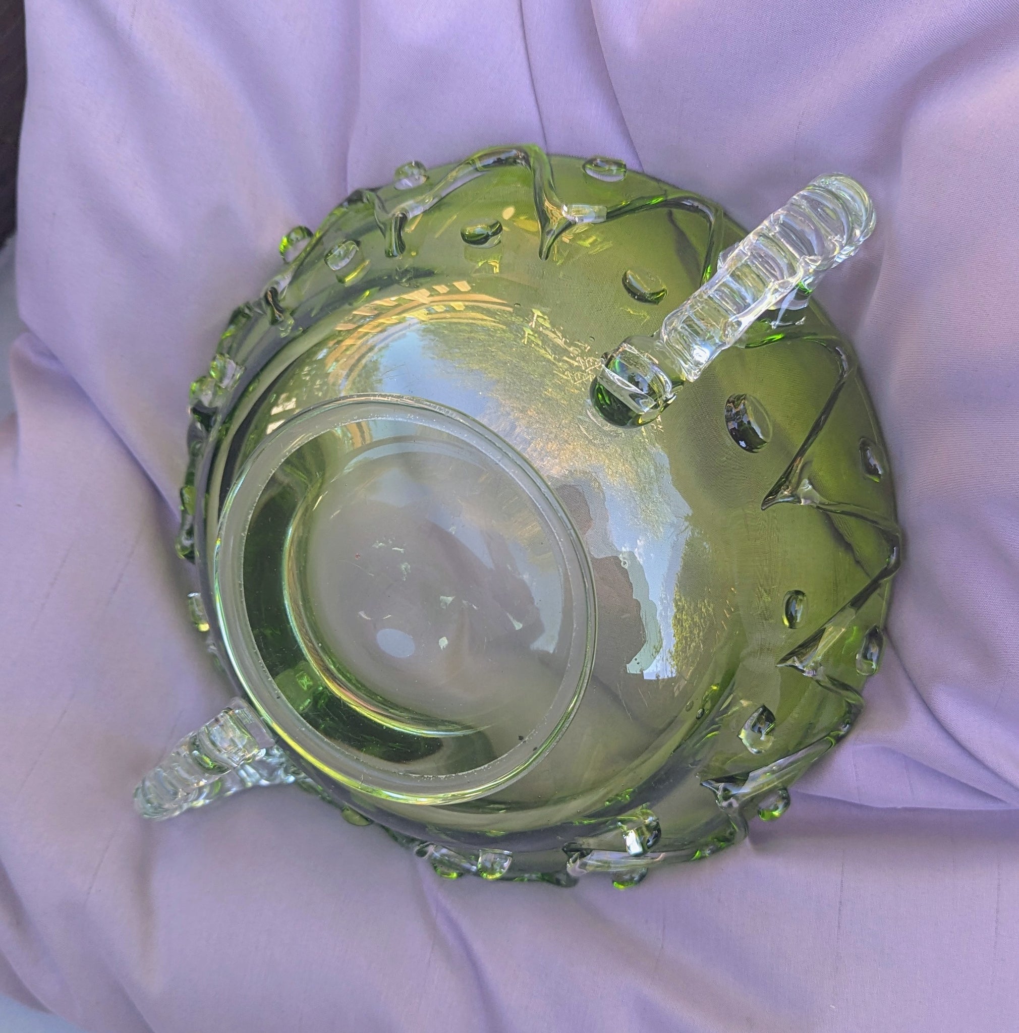 Beautiful (Murano?) hand-blown art glass centerpiece bowl in brilliant lime-green glass with clear applied handles and raised zig-zag droplet detailing.